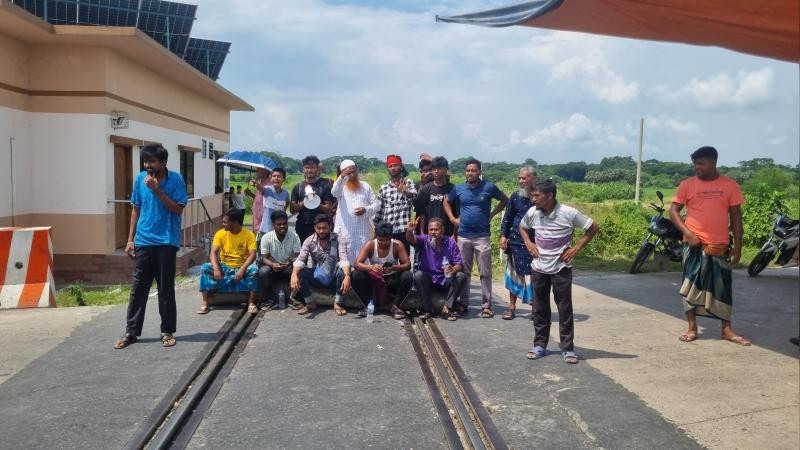 Kaidubi Rail Gate gatekeeper, Mustafizur Rahman, confirmed that locals blocked the railway gate with tree trunks from 7:30 a.m., preventing all train movement since morning.