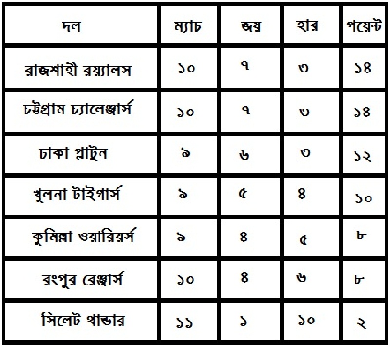 এক নজরে দেখে নিন বিপিএলের পয়েন্ট টেবিল
