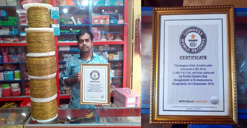 সোনালী রঙ্গের ছোট সেফটি পিন দিয়ে পৃথিবীর সবচেয়ে দীর্ঘ চেইন তৈরি করে গিনেস বুকে নাম লেখালেন ব্রাহ্মণবাড়িয়ার নাসিরনগর উপজেলার ফান্দাউক গ্রামের পার্থ চন্দ্রদেব। সাত হাজার ৮শ’ ৭৭ ফুট দৈর্ঘ্যের সেফটিপিনের চেইন তৈরি করে তিনি জায়গা করে নিয়েছেন গিনেস ওয়ার্ল্ড রেকর্ডসে। ১৭ই সেপ্টেম্বর হাতে পেয়েছেন বিশ্ব রেকর্ড গড়ার স্বীকৃতিপত্র। ব্রাহ্মণবাড়িয়ার নাসিরনগর উপজেলার ফান্দাউক ইউনিয়নে জগদীশ চন্দ্রের ছেলে পার্থ চন্দ্র দেব। পড়াশোনার পাশাপাশি স্থানীয় বাজারে বড় ভাইয়ের সঙ্গে একটি স্টেশনারি দোকান চালান। গেল বছর হঠাৎ করেই সেফটিপিন দিয়ে চেইন তৈরির ইচ্ছা জাগে পার্থর। খোঁজ নিয়ে জানতে পারেন ১৭শ’ ৩৩ মিটার দৈর্ঘ্যর চেইন তৈরির বিশ্ব রেকর্ড ভারতের হার্শা নান ও নাভা নান এর দখলে। সেই রেকর্ড ভাঙার উদ্দেশ্যে গিনেস ওয়ার্ল্ড রেকর্ডস এ যোগাযোগ করেন পার্থ। ২৩শে জুলাই গিনেস কর্তৃপক্ষর সম্মতি পাওয়ার পর ৪৫ দিনে এক লাখ ৮৭ হাজার ৮২৩টি সোনালী রঙের সেফটিপিন দিয়ে চেইন তৈরি করেন পার্থ। যার দৈর্ঘ্যে ২৪শ’ ১ মিটার বা ৭ হাজার ৮শ’ ৭৭ ফুট। সেপ্টেম্বরের ৬ তারিখে সকাল নয়টা থেকে বিকেল পাঁচটা পর্যন্ত এই চেইনের জরিপ করা হয়। প্রমাণ হিসেবে ছবি ও ভিডিওসহ তথ্য পাঠানো হয় গিনেস কর্তৃপক্ষের কাছে। পরে, ১৭ তারিখে পার্থর প্রচেষ্টাকে স্বীকৃতি দেয় গিনেস ওয়ার্ল্ড রেকর্ডস কর্তৃপক্ষ। গিনেস ওয়ার্ল্ড রেকর্ডসে স্থান পাওয়া তরুণ পার্থ চন্দ্র দেব বলনে, ‘আমি অনেক বেশি আনন্দিত। যা আশা করেছিলাম, তার চেয়ে বেশি পেয়েছি বলেই মনে হচ্ছে। এখানে আমি আমার এলাকার সবার সহযোগীতা পেয়েছি।’ পার্থ জানান, মানুষের ভালবাসায় কৃতজ্ঞ তিনি। এই ভালোবাসা নিয়ে আগামী দিনগুলোতে তিনি বেঁচে থাকতে চান। উপজেলা নির্বাহী কর্মকর্তা নাজমা আশরাফীর মতে পার্থর এই অর্জন যুব সমাজের জন্য একটি দৃষ্টান্ত। একটি রেকর্ড গড়েই থেমে যেতে চান না পার্থ। নতুন পরিকল্পনা হিসেবে এবার স্টেপলারের পিন দিয়ে আরেকটি চেইন তৈরির কাজ এরই মধ্যে শুরু করেছেন তিনি। গিনেস বুক অফ ওয়ার্ল্ড রেকর্ড করার পর তার স্বীকৃতি দেখার জন্যে বিভিন্ন স্থান থেকে বিভিন্ন শ্রেণী পেশার উৎসুক মানুষ এসে ভিড় করছেন পার্থের বাড়িতে।