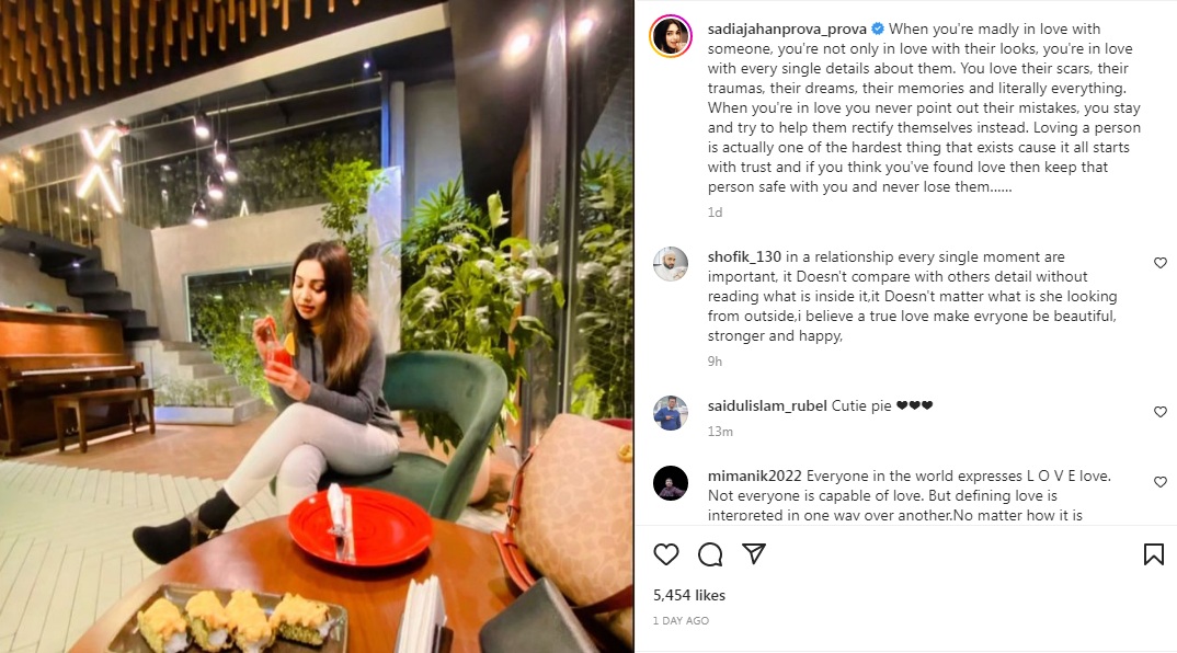 দেশের ছোটপর্দার জনপ্রিয় অভিনেত্রী সাদিয়া জাহান প্রভা। সামাজিক যোগাযোগ মাধ্যমে বেশ সরব তিনি। নিজের ভাবনা, অভিজ্ঞতাগুলো নিয়মিত ভক্তদের সঙ্গে ভাগ করে নেন তিনি। সম্প্রতি ইনস্টাগ্রাম হ্যান্ডেলে নিজের একটি ছবি পোস্ট করেছেন প্রভা। সেখানে প্রেম-ভালোবাসা নিয়ে রহস্যজনক পোস্ট করেছেন।