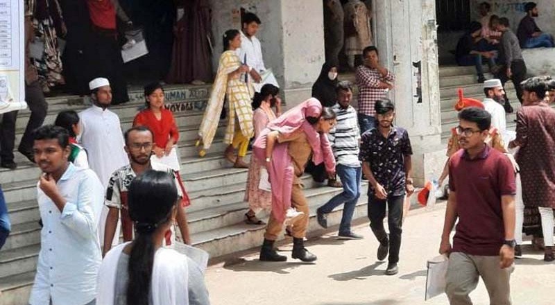 পিঠে বয়ে পরীক্ষার্থীকে হলে পৌঁছানোয় প্রশংসা কুড়াচ্ছে জবি বিএনসিসি
