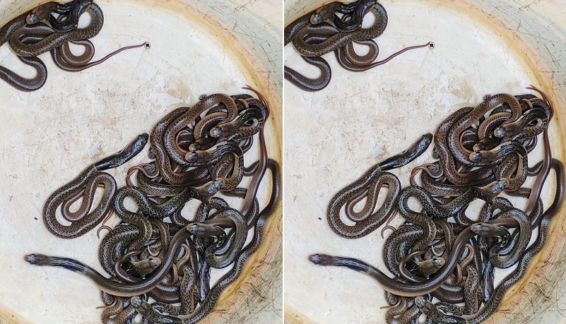 বাড়ীতে ইঁদুরের গর্ত ভেবে তেমন গুরুত্ব ছিল না। দীর্ঘ কয়েকমাস পর সেই পাকা মেঝে সংস্কার করার সিদ্ধান্ত নেয়। সবাই ভেবেছিলেন গর্তের ভেতরে হয়ত ইঁদুরের বসবাস করে। কিন্তু সংস্কারকাজ করতে গিয়ে গর্তটির ভেতর বেরিয়ে আসে ১৯টি বিষধর সাপের বাচ্চা। বৃহস্পতিবার সকালে বিষয়টি নিশ্চিত করেছেন শেরপুর উপজেলা নির্বাহী অফিসার সুমন জিহাদী। সাপ নিয়ে আতঙ্ক থেকে স্থায়ীভাবে মুক্তি চান স্থানীয়রা। গতকাল বুধবার বিকেলে বগুড়ার শেরপুর পৌর শহরের উত্তর সাহাপাড়া মহল্লার হরিজনপল্লিতে এ ঘটনা ঘটে। পরে বন বিভাগের সহযোগিতায় এগুলো প্রাকৃতিক পরিবেশে অবমুক্ত করা হয়।