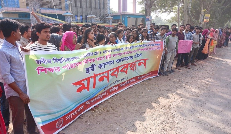 সোমবার দুপুরে অনুষ্ঠিত মানববন্ধনে সাধারণ শিক্ষার্থীদের পক্ষে বক্তব্য রাখেন, হৃদয় সরকার, শামীম হাসান, হাবিব, পিয়াস, বায়জিদ, মওদুদ প্রমুখ। বক্তারা বলেন, ২০১৬ সালে কবিগুরুর নামে প্রতিষ্ঠিত বিশ্ববিদ্যালয়টির বয়স ৮ বছর পাড় হলেও এখনো বিভিন্ন ভাড়া জায়গায় অ্যাকাডেমিক কাজ এবং পাঠদান চলে আসছে। বর্তমানে এই বিশ্ববিদ্যালয়ে বিভিন্ন সেশনে ১২'শ এর বেশি শিক্ষার্থী অধ্যয়নরত। এত পরিমাণ শিক্ষার্থীদের জন্য নাই স্থায়ী ক্যাম্পাস। অতীতে ২ জন ভিসি নানা রকম নিয়োগ বাণিজ্য এবং বিশেষ পার্পাস সার্ব করতে ব্যস্ত থাকায় ক্যাম্পাসের কাজ করতে পারেননি। এখন শিক্ষার্থীসহ সকল মানুষের প্রাণের দাবী হয়ে উঠেছে বিশ্ববিদ্যালয়ের স্থায়ী ক্যাম্পাস। এসময় শিক্ষার্থীরা স্থায়ী ক্যাম্পাস না হওয়া পর্যন্ত আন্দোলন চালিয়ে যাওয়ার ঘোষণা দেন।