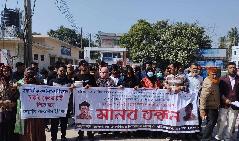 চাকরিচ্যুত ব্যক্তিদের চাকরিতে পুনর্বহাল ও নিরীহ কারাবন্দি বিডিআর (বর্তমান বিজিবি) সদস্যদের মুক্তির দাবিতে নড়াইলে মানববন্ধন অনুষ্ঠিত হয়েছে।