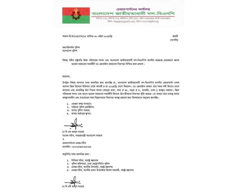 চিঠিতে বলা হয়, জাতীয়তাবাদী দল-বিএনপির চেয়ারপার্সন বেগম খালেদা জিয়া বিদেশে চিকিৎসা শেষে আগামী ৪ মে দেশে ফিরবেন। ডা. জোবাইদা রহমান তার সফর সঙ্গী হিসাবে দেশে আসবেন এবং ধানমন্ডিস্থ তার বাবার বাসায় অবস্থান করবেন। জিয়া পরিবারের সদস্য এবং তারেক রহমানের সহধর্মীণি হিসেবে জোবাইদা রহমানের জীবনের নিরাপত্তা ঝুঁকি রয়েছে। সে কারণে তার ঢাকাস্থ বাসায় অবস্থানকালীন এবং যাতায়াতের সময় নিরাপত্তা ব্যবস্থা গ্রহণের জন্য বিশেষভাবে অনুরোধ করা হলো।