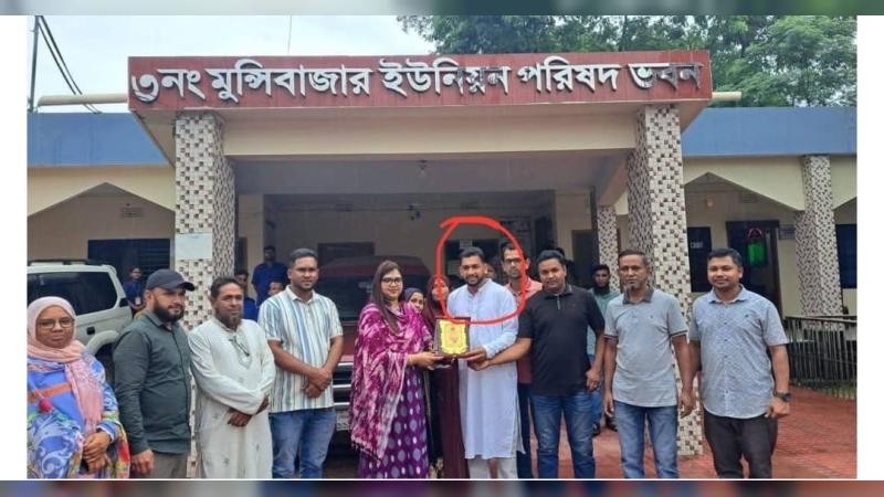 গত বৃহস্পতিবার (৭ আগস্ট) বিকেলে মুন্সিবাজার ইউনিয়ন পরিদর্শনে গিয়ে ইউএনও আফরোজা হাবিব শাপলা এই ছবি তোলেন। ছবিতে দেখা যায়, চেয়ারম্যান রাহেল হোসেন তাঁকে ক্রেস্ট দিচ্ছেন। এই ঘটনা প্রশাসন ও জনগণের মধ্যে চাঞ্চল্য সৃষ্টি করেছে। ডিবি পুলিশের ওপর হামলা এবং বৈষম্যবিরোধী ছাত্র আন্দোলনে হামলায় জড়িত থাকার অভিযোগে চেয়ারম্যান রাহেল হোসেনের বিরুদ্ধে একাধিক মামলা রয়েছে। যাত্রাবাড়ী থানায় দায়ের করা একটি মামলার আসামিও তিনি।