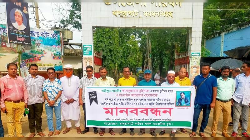 ময়মনসিংহের হালুয়াঘাটে গাজীপুরের সাংবাদিক দৈনিক প্রতিদিনের কাগজ পত্রিকার ষ্টাফ রির্পোটার আসাদুজ্জামান তুহিনকে প্রকাশ্যে কুপিয়ে হত্যা ও সাংবাদিক আনোয়ার হোসেনকে ইট দিয়ে পা থেঁতলে শারীরিক ভাবে গুরুতর আহতের ঘটনায় জড়িত সন্ত্রাসীদের সর্বোচ্চ শাস্তি ফাঁসিসহ সাংবাদিকদের রাষ্ট্রীয় নিরাপত্তার দাবিতে মানববন্ধন অনুষ্ঠিত হয়েছে।