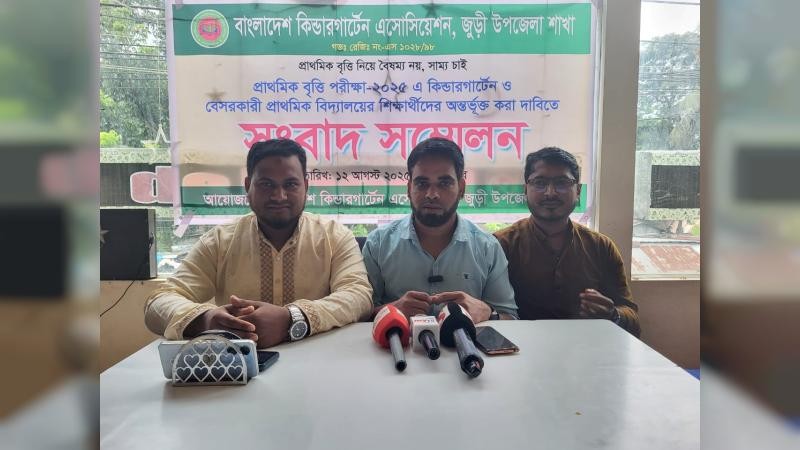 জুড়ীতে বাংলাদেশ কিন্ডারগার্টেন অ্যাসোসিয়েশন (গভঃ রেজিঃ নং এস-১০২৮/৯৮) জুড়ী উপজেলা শাখা প্রাথমিক বৃত্তি পরীক্ষায় কিন্ডারগার্টেন ও বেসরকারি প্রাথমিক বিদ্যালয়ের শিক্ষার্থীদের অংশগ্রহণের সুযোগ প্রদানের দাবিতে সংবাদ সম্মেলন করেছে। দেশব্যাপী কর্মসূচির অংশ হিসেবে মঙ্গলবার (১২ আগস্ট) দুপুরে উপজেলা সদরের একটি রেস্তোরাঁয় এই সংবাদ সম্মেলন অনুষ্ঠিত হয়।