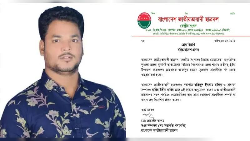 বিজ্ঞপ্তিতে বলা হয়, বাংলাদেশ জাতীয়তাবাদী ছাত্রদল কেন্দ্রীয় সংসদের সিদ্ধান্ত অনুযায়ী সাংগঠনিক শৃঙ্খলা ভঙ্গের সুনির্দিষ্ট অভিযোগের ভিত্তিতে ইটনা উপজেলা ছাত্রদলের আহ্বায়ক আজাদুর রহমান সুজনকে সাংগঠনিক পদ থেকে বহিষ্কার করা হয়েছে।