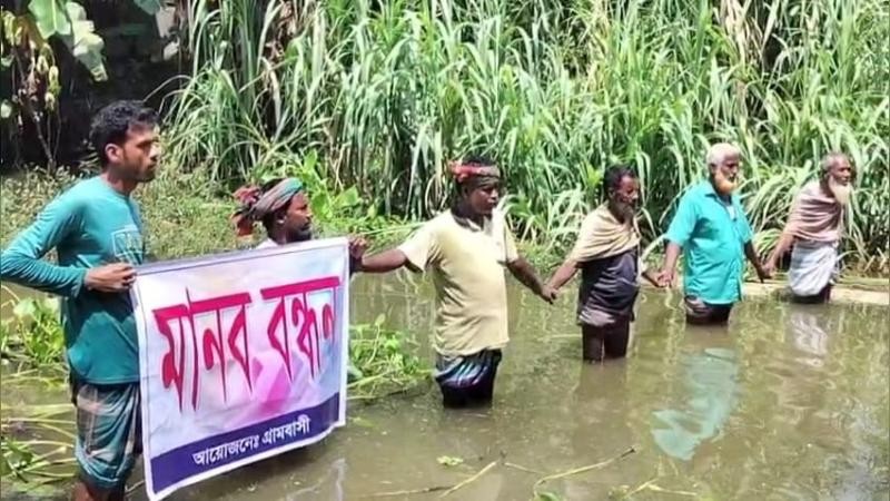 তাই ক্ষুব্ধ হয়ে গ্রামবাসী বরিবার (৩১ আগস্ট) দুপুরে এবার সেই ডুবন্ত রাস্তার পানি নেমেই রাস্তার দাবিতে করেছেন মানববন্ধন।
