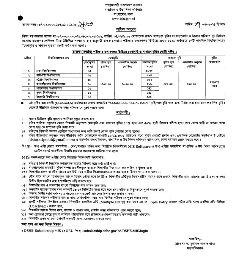 অফিস আদেশে উল্লেখ করা হয়েছে, রাজস্ব খাতভুক্ত বৃত্তির সংখ্যা ও টাকার পরিমাণ পুনর্নির্ধারণ করা হয়েছে। মেধা ও সাধারণ বৃত্তির কোটা বণ্টন করা হয়েছে বিশ্ববিদ্যালয়ভিত্তিক।