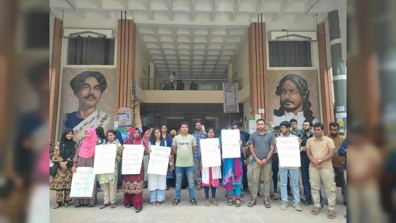 মানববন্ধনে শিক্ষার্থীরা ‘সব কাজ চলমান তবে শিক্ষক নিয়োগে গাফিলতি কেন?’, ‘চারুকলায় অন্য বিভাগের শিক্ষক কেন?’, ‘সৎ, দক্ষ ও যোগ্য শিক্ষক চাই’সহ বিভিন্ন লেখা সম্বলিত প্ল্যাকার্ড হাতে প্রতিবাদ জানান।