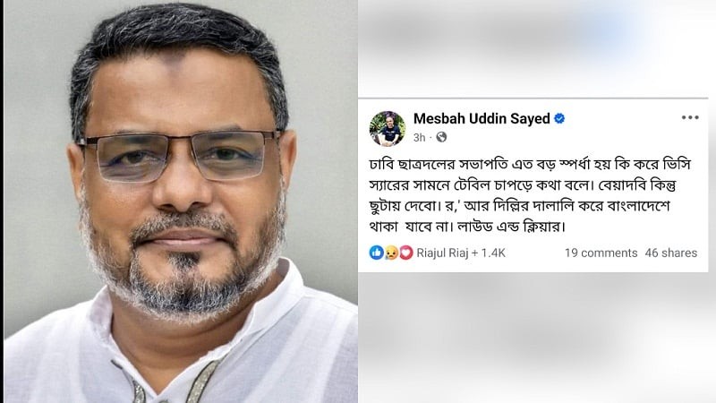 তাতে তিনি লেখেন, ‘ঢাবি ছাত্রদলের সভাপতির এত বড় স্পর্ধা হয় কী করে, ভিসি স্যারের সামনে টেবিল চাপড়ে কথা বলে। বেয়াদবি কিন্তু ছুটায় দেব। ‘‘র’’ আর দিল্লির দালালি করে বাংলাদেশে থাকা যাবে না। লাউড অ্যান্ড ক্লিয়ার।’ মুহূর্তে এটি সামাজিক যোগাযোগমাধ্যমে ছড়িয়ে পড়লে সমালোচনার ঝড় ওঠে।