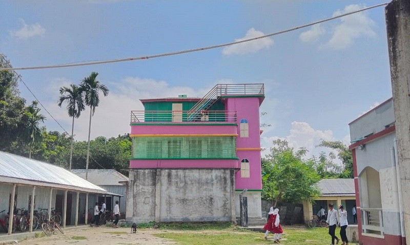 সরেজমিন স্কুলে গিয়ে দেখা যায়, শুনশান নিরবতার মধ্যে চলছে স্কুলের পাঠদান। স্কুলের পরিবেশ খুবই চকচকে ও শান্ত। এরই মধ্যে দেখা মেলে শহীদ মিনার ঘেঁষে স্কুলের ঠিক মাঝখানে তিনতলা বিশিষ্ট একটি বিল্ডিং বাড়ি। বিল্ডিং বাড়ির পুর্বে স্কুলের একটি টিনের ঘর, পশ্চিমে আরেকটি টিনের ঘরে গাদাগাদি করে শিক্ষার্থীদের পাঠদান করানো হচ্ছে। বাড়িতে প্রবেশের পথও স্কুলের ভিতর দিয়ে করা হয়েছে। এজন্য স্কুলের গেটও করতে পারেনি কর্তৃপক্ষ।