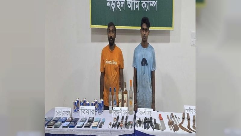 নড়াইল শহরের রূপগঞ্জ বাজারে একটি মুদি দোকানে অভিযান চালিয়ে বিপুল পরিমাণ দেশিয় অস্ত্র, বিদেশী চাকু, মদ ও চোরাই মোবাইলসহ দুই জনকে আটক করেছে সেনাবাহিনী। বুধবার (১৭ সেপ্টেম্বর) রাত ৮ টা থেকে মধ্য রাত ১ টা পর্যন্ত এ অভিযান চালায় নড়াইল সেনা ক্যাম্প। এসময় জেলা পুলিশের একটি দল সেনাবাহিনীর সাথে যোগ দেন। আটক ব্যক্তিরা হলেন- নড়াইল সদরের মুশুরিয়া গ্রামের নিখিল কুন্ডুর ছেলে পিনাক কুন্ডু(৩৬) ও একই উপজেলার বেনাহাটি গ্রামের সুবাস বিশ্বাসের ছেলে শুভ বিশ্বাস (২১)।