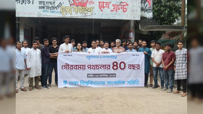 শুক্রবার (১৯ সেপ্টেম্বর) বিকেলে প্রতিষ্ঠাবার্ষিকী উপলক্ষে ডাকসু ক্যাফেটেরিয়ার শিক্ষক লাউঞ্জে অনুষ্ঠিত আলোচনা সভায় বিশ্ববিদ্যালয়ের শিক্ষক, প্রশাসন, প্রাক্তন ও বর্তমান সাংবাদিক সমিতির সদস্যরা অংশ নেন।