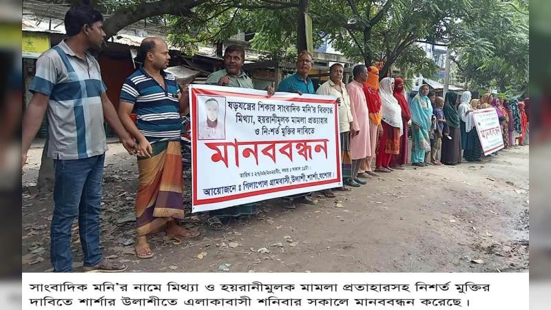 শনিবার (২৭ শে সেপ্টেম্বর) সকাল ১১ টার দিকে যশোর-সাতক্ষীরা মহাসড়কের শার্শা উপজেলার উলাশী গিলাপোল এ মানববন্ধন করে তারা। এ সময় গিলাপোল এলাকার শতশত নারী-পুরুষ মানববন্ধনে অংশগ্রহন করেন। মনি দীর্ঘদিন সাংবাদিক পেশার সাথে জড়িত। তিনি যশোর থেকে প্রকাশিত দৈনিক লোকসমাজ ও জাতীয় দৈনিক আমার দেশ পত্রিকায় শার্শা উপজেলা প্রতিনিধি হিসাবে কর্মরত আছে।