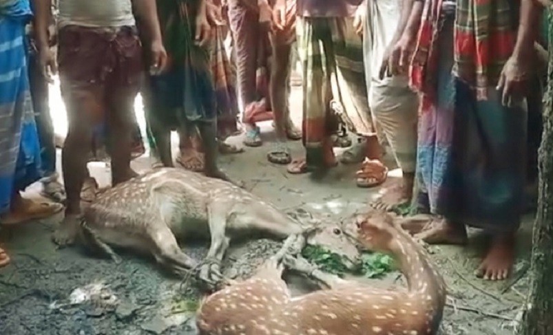 করমজল বন্যপ্রাণী প্রজনন কেন্দ্রের ভারপ্রাপ্ত কর্মকর্তা হাওলাদার আজাদ কবির জানান, গ্রামবাসীর কাছ থেকে খবর পেয়ে বন বিভাগের করমজল ও বৈদ্যমারী স্টেশনের সদস্যরা এলাকাবাসীর সহযোগিতায় ওই হরিণ দুটিকে উদ্ধার করে করমজল প্রজনন কেন্দ্রে নিয়ে আসে। ধারণা করা হচ্ছে, রাতের বেলা বাঘের তাড়া খেয়ে হরিণ দুটি প্রাণ বাঁচাতে সোয়া দুই কিলোমিটার প্রশস্ত খরস্রোতা পশুর নদী সাঁতরে পার হয়ে লোকালয়ে চলে গিয়েছিল। পরবর্তীতে দীর্ঘক্ষণ পরিচর্যা শেষে হরিণ দুটিকে সুন্দরবনে অবমুক্ত করা হয়।