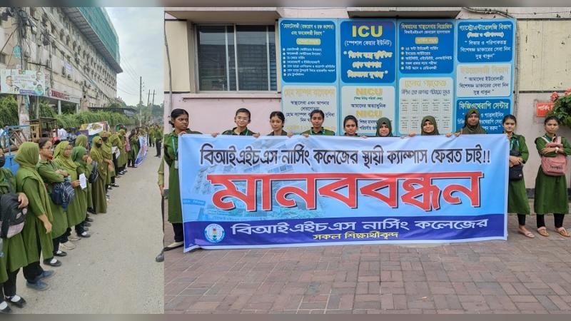 স্থায়ী ক্যাম্পাস ফিরিয়ে দেওয়া এবং শিক্ষার স্বাভাবিক পরিবেশ নিশ্চিত করার দাবিতে মানববন্ধন করেছে বাংলাদেশ ইনস্টিটিউট অব হেলথ সায়েন্সেস (বিআইএইচএস) নার্সিং কলেজের শিক্ষার্থীরা। এ সময় তারা তাদের শিক্ষাজীবন নিয়ে গভীর উদ্বেগ প্রকাশ করেন এবং কর্তৃপক্ষের জরুরি হস্তক্ষেপ কামনা করেন।