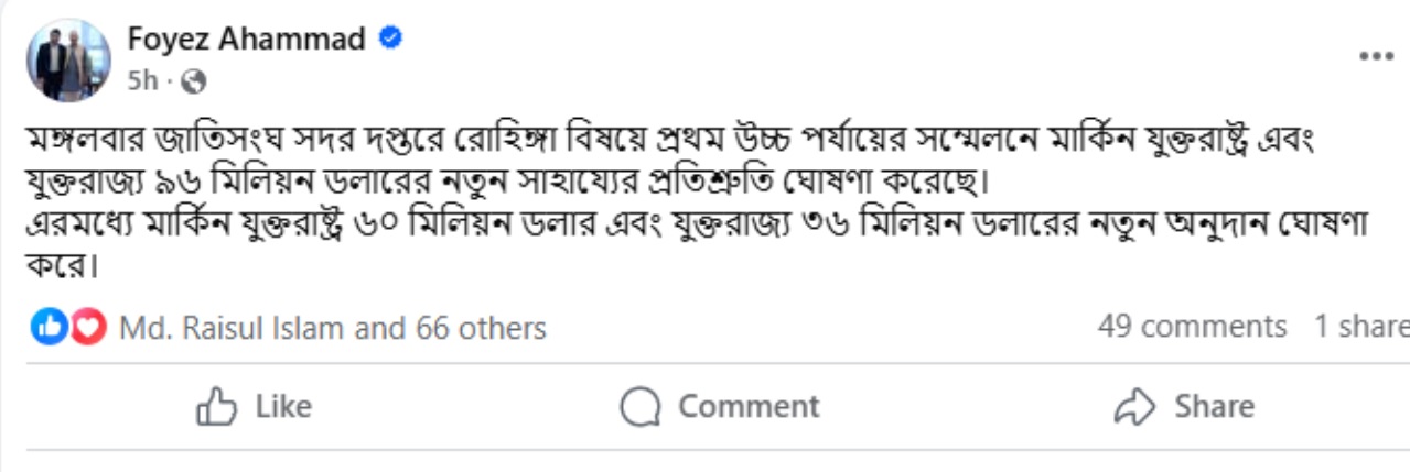 পোস্টে তিনি লেখেন, মঙ্গলবার জাতিসংঘ সদর দপ্তরে রোহিঙ্গা বিষয়ে প্রথম উচ্চ পর্যায়ের সম্মেলনে মার্কিন যুক্তরাষ্ট্র ও যুক্তরাজ্য ৯৬ মিলিয়ন ডলারের নতুন সাহায্যের প্রতিশ্রুতি ঘোষণা করেছে। এর মধ্যে যুক্তরাষ্ট্র ৬০ মিলিয়ন ডলার এবং যুক্তরাজ্য ৩৬ মিলিয়ন ডলার অনুদান ঘোষণা করে।