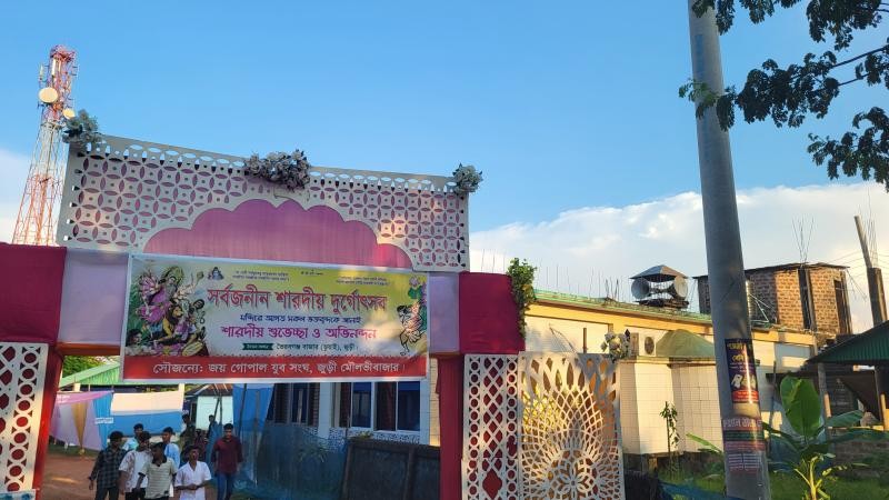 একপাশে মন্দিরে হিন্দু ধর্মাবলম্বীরা পূজা-অর্চনা করছেন, অন্যপাশে মসজিদে মুসলমানরা নামাজ আদায় করছেন। হিন্দু ধর্মাবলম্বীদের সবচেয়ে বড় উৎসব শারদীয় দুর্গাপূজা শুরু হয়েছে। ভূয়াই দুর্গা মণ্ডপে পূজা উদযাপনের দৃশ্যটা তাই একটু অন্যরকম।
