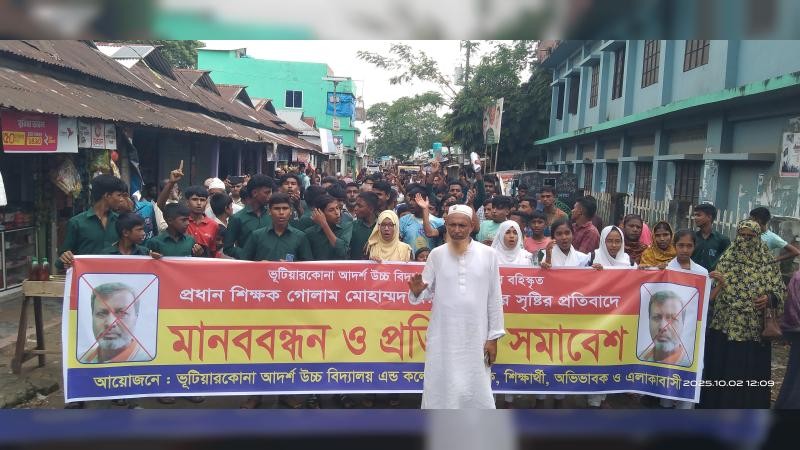 ময়মনসিংহের গৌরীপুর উপজেলার ভূটিয়ারকোনা আদর্শ স্কুল অ্যান্ড কলেজের প্রধান শিক্ষক গোলাম মোহাম্মদের বিরুদ্ধে নৈরাজ্য ও অনিয়মের অভিযোগ এনে মানববন্ধন ও প্রতিবাদ সমাবেশ করেছেন এলাকাবাসী, শিক্ষক, অভিভাবক ও শিক্ষার্থীরা। বৃহস্পতিবার (২ অক্টোবর/২৫) দুপুর ১২টায় মাওহা ইউনিয়নের ভূটিয়ারকোনা আদর্শ স্কুল অ্যান্ড কলেজ প্রাঙ্গণে এ মানববন্ধন অনুষ্ঠিত হয়। এতে বিপুলসংখ্যক মানুষ অংশগ্রহণ করেন।