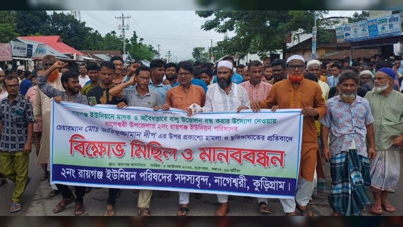 কুড়িগ্রামের নাগেশ্বরী উপজেলার রায়গঞ্জ ইউপি চেয়ারম্যান আরিফুজ্জামান দীপ মণ্ডলের ওপর হামলা ও ছুরি দিয়ে আঘাত করে আহত করার প্রতিবাদে বিক্ষোভ ও মানববন্ধন করেছে এলাকাবাসী।