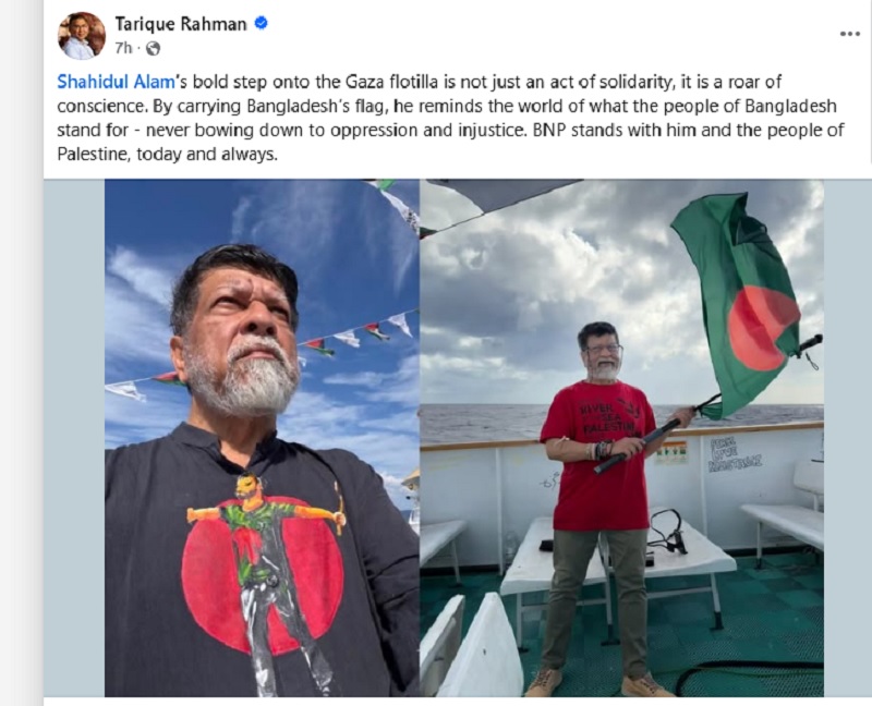 পোস্টে তারেক রহমান বলেন, গাজামুখী নৌবহরে অংশ নেওয়া শহীদুল আলমের উদ্যোগ কেবল সংহতির প্রতীক নয়, বিবেকের এক গর্জন। তিনি বাংলাদেশের পতাকা বহন করে বিশ্বকে স্মরণ করিয়েছেন, বাংলাদেশের জনগণ কখনও নিপীড়ন ও অবিচারের কাছে মাথা নত করেনি, ভবিষ্যতেও করবে না।