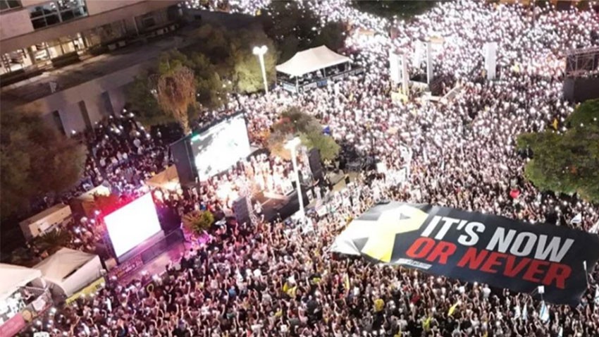 টাইমস অব ইসরায়েলের প্রতিবেদন অনুসারে, 'এখন নয়তো কখনোই না' - লেখা সম্বলিত বিশাল ব্যানার নিয়ে জনতা বিক্ষোভ করে। মার্কিন প্রেসিডেন্ট ডোনাল্ড ট্রাম্প নিজেই বার্তাটি প্রতিধ্বনিত করছেন এবং ব্যানারের ছবি পোস্ট করছেন।