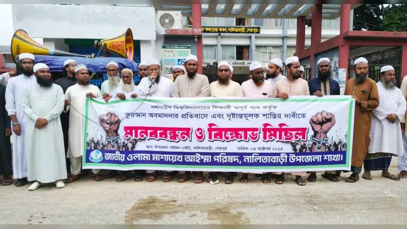 ঢাকার বারিধারায় অবস্থিত নর্থ সাউথ বিশ্ববিদ্যালয়ের শিক্ষার্থী অপূর্ব পাল কর্তৃক পবিত্র কুরআন অবমাননার ঘটনায় প্রতিবাদ জানিয়ে মানববন্ধন ও বিক্ষোভ মিছিল করেছে নালিতাবাড়ী উপজেলার উলামা মাশায়েখ আইম্মা পরিষদ। একই সঙ্গে অভিযুক্ত ব্যক্তির সর্বোচ্চ দৃষ্টান্তমূলক শাস্তির দাবিও জানান তারা।