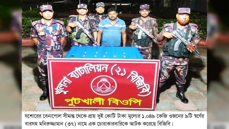 যশোরের বেনাপোল সীমান্ত থেকে প্রায় দুই কোটি টাকা মূল্যের ১.০৪৯ কেজি ওজনের ৯টি স্বর্ণের বারসহ মনিরুজ্জামান (৩৭) নামে এক চোরাকারবারিকে আটক করেছে বর্ডার গার্ড বাংলাদেশ (বিজিবি)।