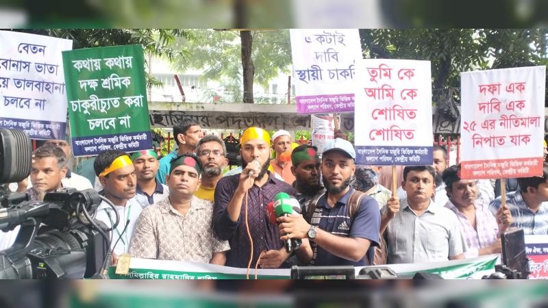 বাংলাদেশ দৈনিক মজুরি ভিত্তিক কর্মচারী কল্যাণ পরিষদের কেন্দ্রীয় কার্যনির্বাহী কমিটি দৈনিক ভিত্তিক সাময়িক শ্রমিক নীতিমালা ২০২৫ বাতিল করে সরকারি দপ্তর, অধিদপ্তর, পরিদপ্তর ও স্বায়িত্তশাসিত প্রতিষ্ঠানে মজুরি ভিত্তিতে কর্মরতদের বয়স শিথিল করে শ্ব শ্ব প্রতিষ্ঠানে স্থায়ীকরণের এক দফা দাবিতে বিক্ষোভ সমাবেশ করে।