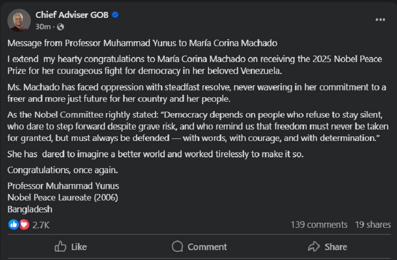 মাচাদোর সাহসী নেতৃত্ব এবং গণতন্ত্র প্রতিষ্ঠার লড়াইকে বিশেষভাবে প্রশংসা করেছেন ড. ইউনূস। বার্তায় উল্লেখ করা হয়, ‘মাচাদো কঠোর দমন সত্ত্বেও দেশ ও জনগণের জন্য একটি মুক্ত ও ন্যায়সঙ্গত ভবিষ্যতের জন্য অবিচল প্রতিজ্ঞার সঙ্গে লড়াই করেছেন।