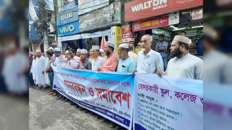 ৬ দফা দাবি আদায়ের লক্ষ্যে বরগুনায় মানববন্ধন ও সমাবেশ করেছে বেসরকারি স্কুল, কলেজ ও মাদ্রাসার শিক্ষক ও কর্মচারীবৃন্দ।