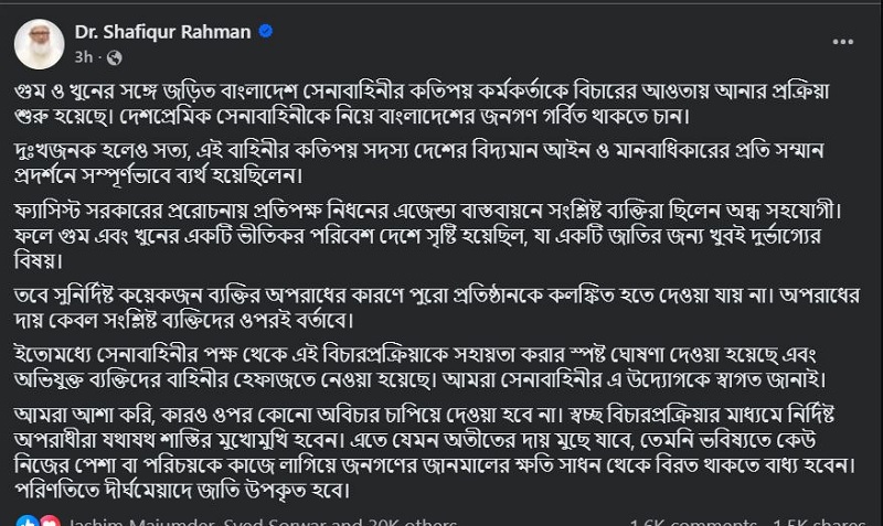 গুম ও খুনের সঙ্গে জড়িত কিছু কর্মকর্তার বিষয়ে সেনাবাহিনীর পদক্ষেপকে স্বাগত জানিয়ে ফেসবুকে একটি পোস্ট করেছেন বাংলাদেশ জামায়াতে ইসলামীর আমির ডা. শফিকুর রহমান।