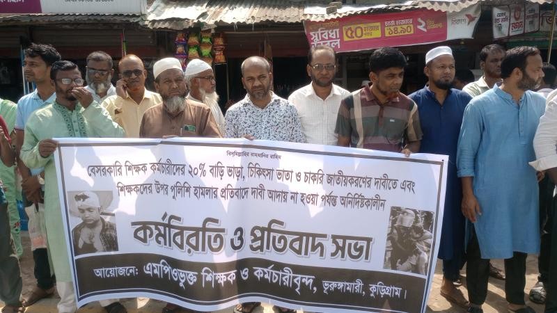কুড়িগ্রামের ভূরুঙ্গামারীর এমপিওভুক্ত বেসরকারি শিক্ষা প্রতিষ্ঠানের শিক্ষক-কর্মচারীরা ২০ শতাংশ বাড়ি ভাড়া, চিকিৎসা ভাতা ও চাকরির জাতীয়করণের দাবিতে কর্মবিরতি ও প্রতিবাদ সভা করেছে। দাবি আদায় না হওয়া পর্যন্ত শিক্ষক-কর্মচারীরা এ কর্মসূচী চালিয়ে যাওয়ার ঘোষণা দিয়েছেন।