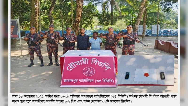 জামালপুর ব্যাটালিয়নের (৩৫ বিজিবি) অধিনায়ক লেফটেন্যান্ট কর্নেল হাসানুর রহমান, পিএসসি-এর সার্বিক নির্দেশনায় গোয়েন্দা তথ্যের ভিত্তিতে মাদক ও চোরাচালানবিরোধী অভিযান পরিচালিত হয়েছে। রৌমারী উপজেলায় জামালপুর ব্যাটালিয়নের (৩৫ বিজিবি)-এর অধীনস্থ রৌমারী বিওপির সীমান্ত পিলার ১০৬৪/এমপি থেকে আনুমানিক ২০০ গজ বাংলাদেশের অভ্যন্তরে সোমবার, ১৩ অক্টোবর, উপজেলার ব্যাপারীপাড়া নামক স্থান থেকে ভারতীয় ইয়াবা ১০২ পিস এবং দুটি বাটন মোবাইলসহ দুই আসামিকে আটক করা হয়েছে। আটককৃতরা হলেন মনোয়ারুল ইসলাম (২৭), পিতা মৃত তসলিম উদ্দিন এবং মো. নূর আলম (৩৯), পিতা মৃত আ. রহমান (নয়ামিয়া)। উভয়ের গ্রাম হাজীপাড়া, পোস্ট থানা হাট, থানা চিলমারী, জেলা কুড়িগ্রাম। জব্দকৃত মাদকদ্রব্যসহ আসামিদের রৌমারী থানায় হস্তান্তরের কার্যক্রম প্রক্রিয়াধীন। জামালপুর ব্যাটালিয়ন (৩৫ বিজিবি)-এর সহকারী পরিচালক (ভারপ্রাপ্ত অ্যাডজুট্যান্ট) ইমাম হোসেন এক সংবাদ বিজ্ঞপ্তিতে বিষয়টি নিশ্চিত করেছেন।