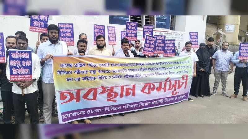 দেশের প্রান্তিক পর্যায়ে সরকারি হাসপাতালগুলোতে চলমান চিকিৎসক সংকট নিরসন এবং ৪৪তম, ৪৫তম, ৪৬তম, ৪৭তম বিসিএস পরীক্ষায় স্বাস্থ্য ক্যাডারের ওভারল্যাপিং নিরসনে ৪৮তম বিসিএস থেকে ৩১২০ জনের অতিরিক্ত লিখিত ও মৌখিক পরীক্ষায় উত্তীর্ণ অপেক্ষমাণ চিকিৎসকদের নিয়োগ দেওয়ার দাবিতে মহাখালী স্বাস্থ্য অধিদপ্তরের সামনে অবস্থান কর্মসূচি পালন করেছে ৪৮তম বিসিএস নিয়োগপ্রত্যাশী সাধারণ চিকিৎসক ফোরাম।