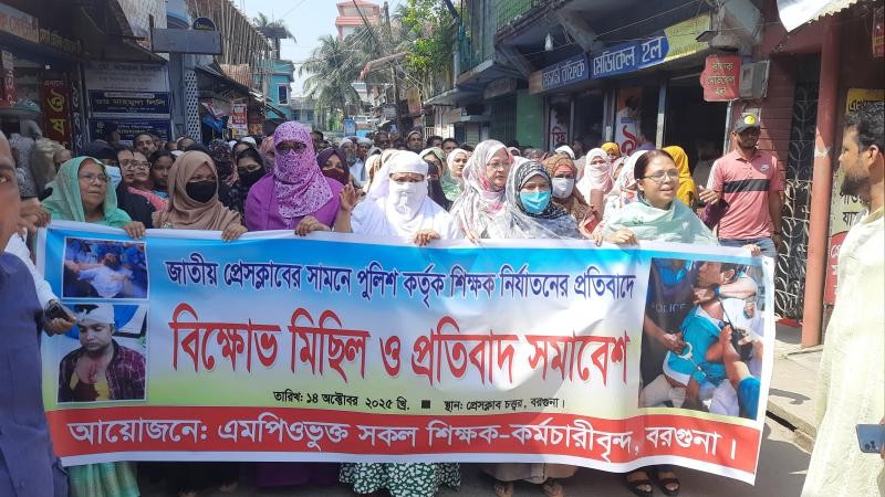 জাতীয় প্রেসক্লাবের সামনে পুলিশ কর্তৃক শিক্ষক নির্যাতনের প্রতিবাদে বরগুনায় শিক্ষক-কর্মচারীবৃন্দের আয়োজনে একটি বিক্ষোভ মিছিল ও প্রতিবাদ সমাবেশ অনুষ্ঠিত হয়েছে।
