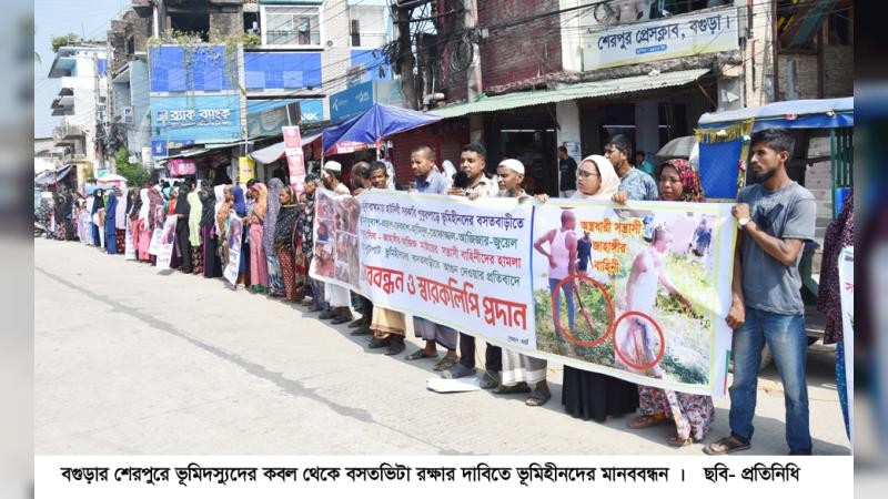 বগুড়ার শেরপুর উপজেলায় ৪০টিরও বেশি ভূমিহীন পরিবারের সরকারি খাস জমি আওয়ামী লীগ সরকারের শাসনকালে ভুয়া দলিল তৈরি করে ৪৩ বছর ধরে ভোগদখলীয় বসতভিটা থেকে উচ্ছেদ করার চেষ্টা এবং মিথ্যা মামলা দিয়ে হয়রানির প্রতিবাদে মানববন্ধন অনুষ্ঠিত হয়েছে।