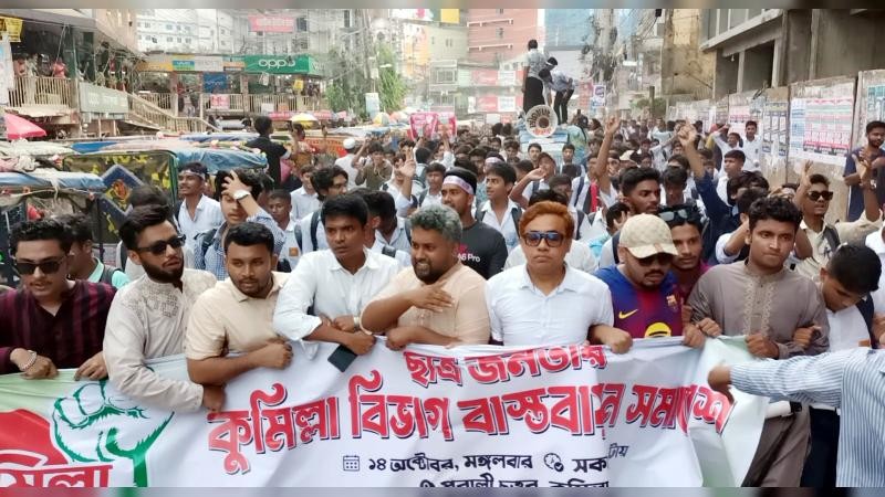 "আমরা কুমিল্লা বিভাগ চাই"—এই স্লোগানে আবারও মুখর হয়ে উঠেছে প্রাচীন নগরী কুমিল্লা। মঙ্গলবার দুপুরে কান্দিরপাড় পূবালী চত্বরে হাজারো শিক্ষার্থী, তরুণ ও সাধারণ মানুষ জড়ো হয়ে কুমিল্লা বিভাগ বাস্তবায়নের দাবিতে এক উচ্ছ্বসিত সমাবেশ করেন। সমাবেশস্থলে ব্যানার, ফেস্টুন আর পোস্টারে ছেয়ে যায় চারদিক। বিভিন্ন শিক্ষা প্রতিষ্ঠানের শিক্ষার্থীরা দলবদ্ধভাবে সেখানে এসে অবস্থান নেন। কেউ হাতে জাতীয় পতাকা, কেউ কণ্ঠে স্লোগান—সব মিলিয়ে কুমিল্লা নগরীর রাজপথ যেন রূপ নেয় দাবির মিছিলে। সমাবেশে বক্তব্য দেন সাবেক ছাত্রনেতা মনছুর নিজামী, গোলাম সামদানী, ছাত্রনেতা ওমর ফারুক শুভ, রিদোয়ান জাহান জিসান, ইয়াসির ফাহিম, মুনতাসীর জারিফসহ অন্যরা। শিক্ষার্থীরা বলেন, প্রাচীন সমতট সভ্যতার ঐতিহাসিক রাজধানী ছিল কুমিল্লা। শিক্ষা, সংস্কৃতি, বাণিজ্য ও প্রশাসনিক কর্মকাণ্ডে এই অঞ্চল বরাবরই ছিল অগ্রগামী। তারা প্রশ্ন তোলেন—"যেখানে বৃহত্তর কুমিল্লার ৬টি জেলার ৪২টি আঞ্চলিক দপ্তর ইতোমধ্যেই কুমিল্লায় পরিচালিত হচ্ছে, সেখানে কুমিল্লা বিভাগ ঘোষণা করতে এত বিলম্ব কেন?" সমাবেশে বক্তারা অভিযোগ করেন, বিভাগ ঘোষণার উদ্যোগ যতবারই সামনে আসে, ততবারই "অদৃশ্য মহল" এর ষড়যন্ত্রে তা থেমে যায়। শিক্ষার্থীরা বলেন, "কুমিল্লা বিভাগের দাবি কোনো রাজনৈতিক নয়, এটি প্রশাসনিক বাস্তবতার প্রতিফলন। উন্নয়ন ত্বরান্বিত করতে, জনসেবা সহজ করতে এবং আঞ্চলিক ভারসাম্য রক্ষায় কুমিল্লাকে বিভাগ ঘোষণা করা জরুরি।" সমাবেশ শেষে শিক্ষার্থীরা নগরীর প্রধান প্রধান সড়কে মিছিল করেন। পথে পথে সাধারণ মানুষ হাত তুলে তাদের দাবির প্রতি সংহতি জানান। অনেক দোকানপাটের সামনে দাঁড়িয়ে ব্যবসায়ীরাও শিক্ষার্থীদের সঙ্গে একাত্মতা প্রকাশ করেন।