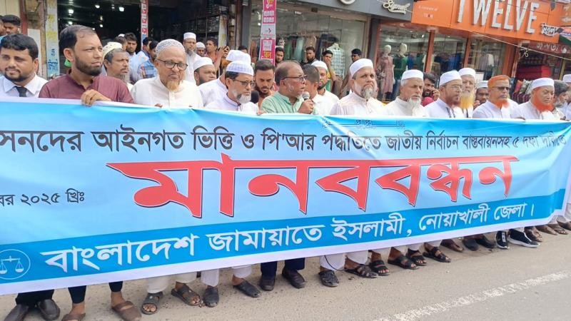 জামায়াতে ইসলামী নোয়াখালী জেলা শাখার উদ্যোগে জুলাই সনদ বাস্তবায়নে গণভোট, পিআর পদ্ধতিতে আগামী ফেব্রুয়ারি মাসে জাতীয় নির্বাচন সহ ৫ দফা দাবি বাস্তবায়নের লক্ষ্যে মানববন্ধন হয়েছে।