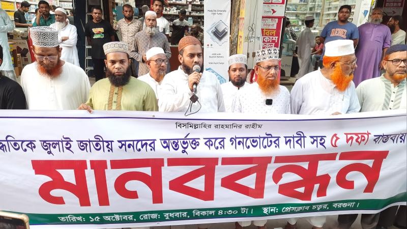 মোঃ আসাদুজ্জামান জুলাই সনদের আইনি ভিত্তি, পিআর পদ্ধতিতে জাতীয় নির্বাচনসহ পাঁচ দফা দাবিতে সারা দেশের ন্যায় বরগুনায় বিক্ষোভ ও মানববন্ধন করেছেন আজ বিকেল পাঁচ টায় বরগুনা প্রেসক্লাব চত্বরে এ মানববন্ধন করেন বরগুনা বাংলাদেশ জামায়াতে ইসলামী,,ও তার অঙ্গ সংগঠন।