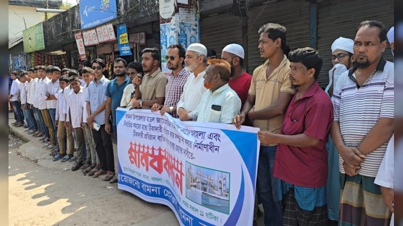 ”আসসালাতু খয়রুম মিনাননাউ” মডেল মসজিদের মিনার হতে আযানের এই পবিত্র বাণীর আহবান শোনার অপেক্ষার পালা ৬ বছরেও শেষ হয়নি বরগুনার বামনা উপজেলার ধর্মপ্রান মুসুল্লিদের। দু’দফায় ঠিকাদার পরিবর্তন হলেও মডেল মসজিদের নির্মাণ কাজের শম্ভুকগতি ইতোমধ্যে স্থানীয়দের মাঝে স্বপ্ন অপূর্ণতার হাতাশা রূপ নিয়েছে জনঅসন্তোষে। ঠিকাদার অপসরণ করে দ্রুত মসজিদের নির্মাণ কাজ সম্পন্ন করার লক্ষ্যে উপজেলার গোলচত্ত্বরে বামনা প্রেসক্লাবের আয়োজনে মানববন্ধন করেছে স্থানীয়রা।