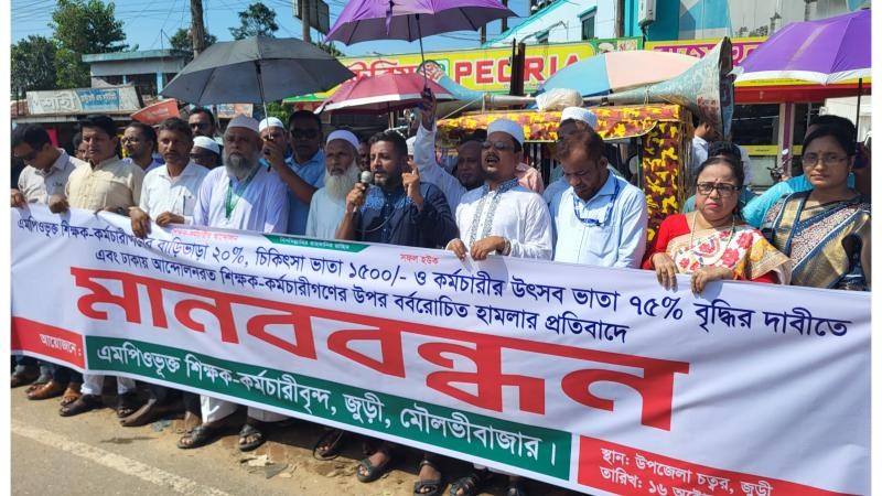 মৌলভীবাজার জেলার জুড়ীতে এমপিওভুক্ত শিক্ষক - কর্মচারীদের বাড়ি ভাড়া ২০%, চিকিৎসা ভাতা ১৫০০ টাকা এবং কর্মচারীদের উৎসব ভাতা ৭৫% এর দাবিতে বৃহস্পতিবার (১৬ অক্টোবর) মানববন্ধন করা হয়েছে।