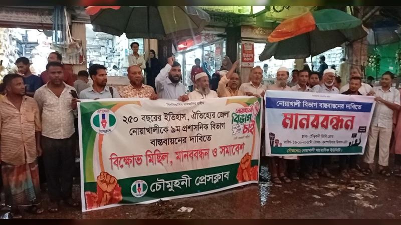 বৃহত্তর নোয়াখালীকে বিভাগ ঘোষণার দাবিতে চৌমুহনীতে মানববন্ধন ও বিক্ষোভ মিছিল করেছে সাংবাদিকেরা। বৃহস্পতিবার বিকেলে চৌমুহনী প্রেসক্লাব চত্বরে প্রধান সড়কে চৌমুহনী প্রেসক্লাব ও নোয়াখালী সাংবাদিক ইউনিটি একই সময়ে এই কর্মসূচির আয়োজন করে।
