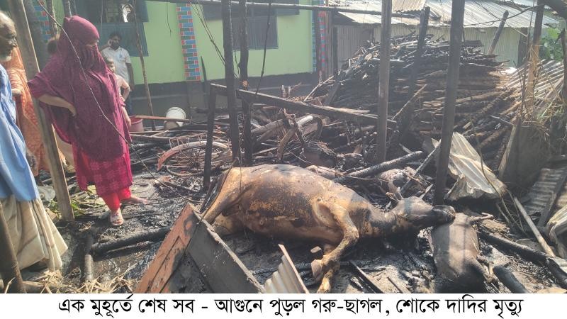 নাটোরের বাগাতিপাড়ায় এক মর্মান্তিক অগ্নিকাণ্ডে এক শ্রমিক পরিবারের স্বপ্ন মুহূর্তেই ছাই হয়ে গেছে। আগুনে পুড়ে মারা গেছে একটি ষাঁড় গরু ও পাঁচটি ছাগল। সেই দৃশ্যের শোকে হৃদযন্ত্রের ক্রিয়া বন্ধ হয়ে মারা গেছেন পরিবারের বৃদ্ধা মমতাজ বেগম (৭০)। শনিবার দুপুরে পৌরসভার পেড়াবাড়িয়া মহল্লায় এই হৃদয়বিদারক ঘটনা ঘটে।