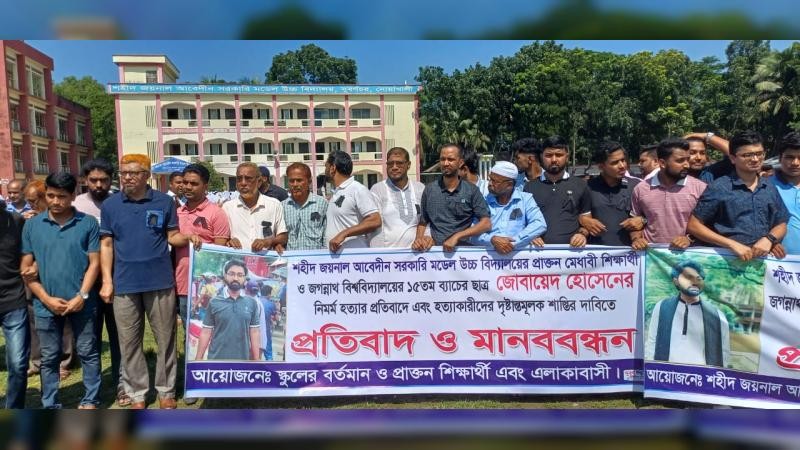 নোয়াখালীর সুবর্ণচর উপজেলার শহীদ জয়নাল আবেদীন সরকারি মডেল উচ্চ বিদ্যালয়ের প্রাক্তন শিক্ষার্থী ও জগন্নাথ বিশ্ববিদ্যালয়ের ১৫ তম ব্যাচের ছাত্র জোবায়েদ হোসেনের নির্মম হত্যার প্রতিবাদে মানববন্ধন অনুষ্ঠিত হয়েছে।