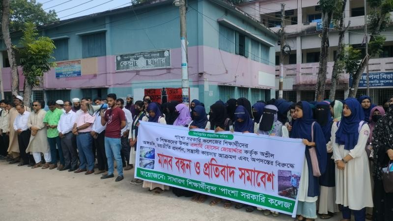 পাংশা সরকারি কলেজের শিক্ষার্থী ও শিক্ষকদের উপর প্রভাবশালী দ্বারা অশোভন আচরণ, অশ্লীল অঙ্গভঙ্গি, ভয়ভীতি প্রদর্শন এবং সন্ত্রাসী কায়দায় আক্রমণের প্রতিবাদে মানববন্ধন ও প্রতিবাদ সমাবেশ অনুষ্ঠিত হয়েছে।