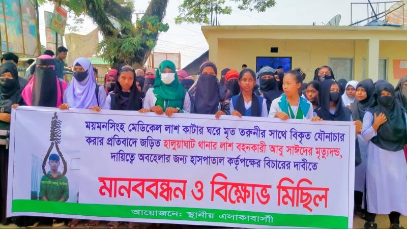 ময়মনসিংহের মেডিকেল কলেজের লাশকাটা ঘরে এক তরুণীর মৃতদেহের সঙ্গে বিকৃত যৌনাচারের প্রতিবাদে হালুয়াঘাটে মানববন্ধন ও বিক্ষোভ মিছিল করেছে এলাকাবাসী।